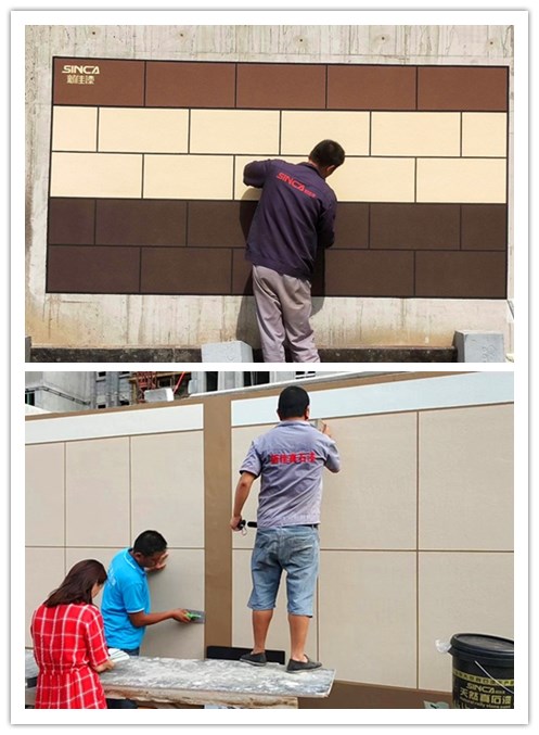 新佳帶(dài)起一起去現場(chǎng)觀看我們的師傅現場(chǎng)制作的真石漆樣闆圖。