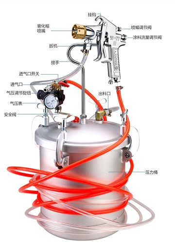 噴槍使用完成後需要将壓力罐與噴槍及時清洗,在不拆除情況下,應将清水倒入灌中,反複(fù)噴洗直至噴出全是清水,存放時應當(dāng)拆卸氣管。